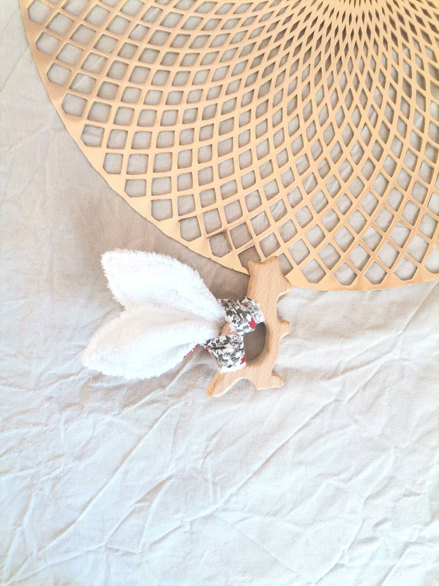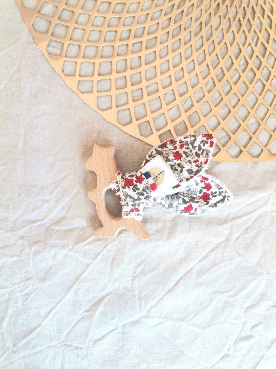 Réalisé avec un tissu à motif 100% coton et un tissu éponge bambou doudou 40% bambou, 40% polyester et 20% coton. Anneau en bois non traité.