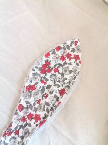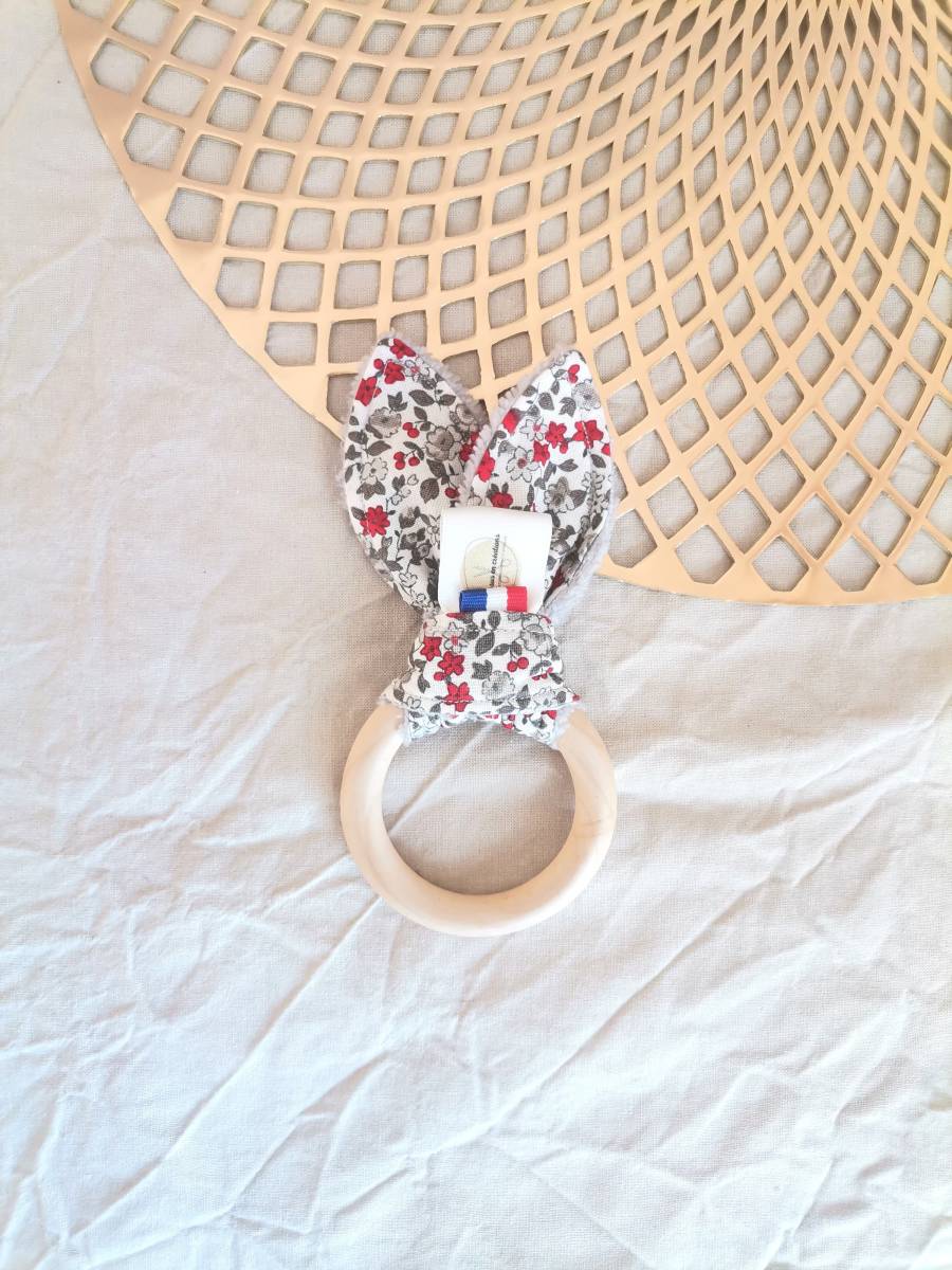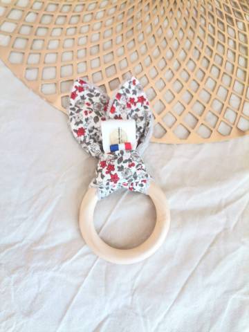 Réalisé avec un tissu à motif 100% coton et un tissu éponge bambou doudou 40% bambou, 40% polyester et 20% coton. Anneau en bois non traité.
